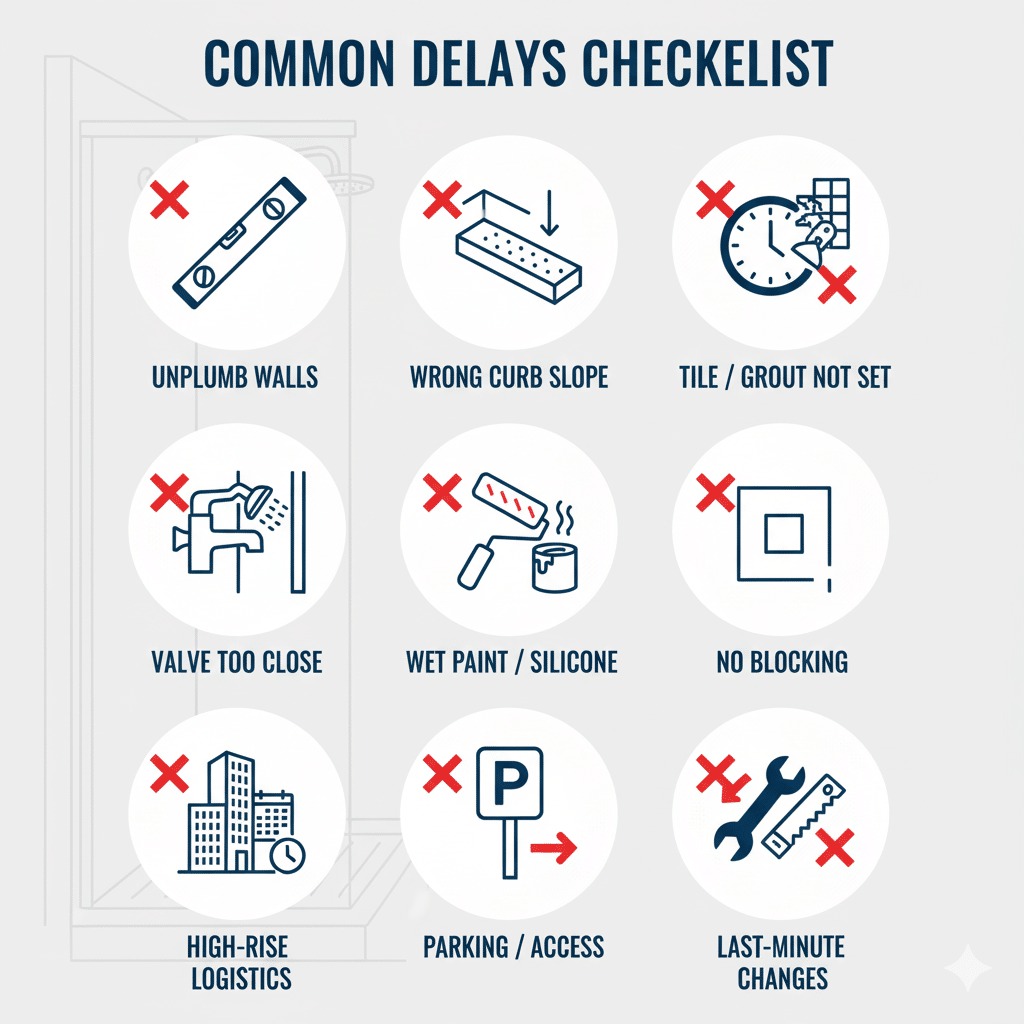 Flag it early. We can suggest quick fixes (threshold, wider panel, minor tile adjustment) so you keep your date and avoid splash issues.